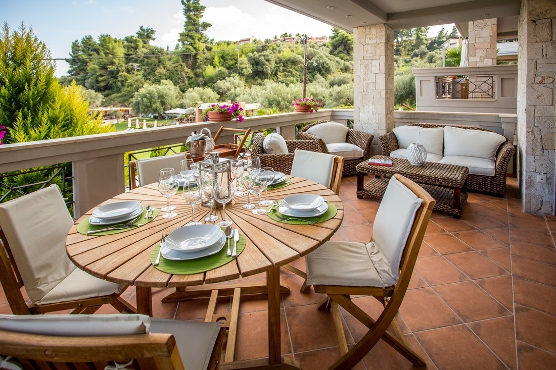- You can bask with the feeling of luxurious carpets laid at your feet, while you can accommodate yourself perfectly in the terrace, which is decorated with bamboo furniture, including a sofa and coffee table, a 2 m. dining table made from teak wood, accompanied by 6 chairs from teak wood, an umbrella and a room service trolley.